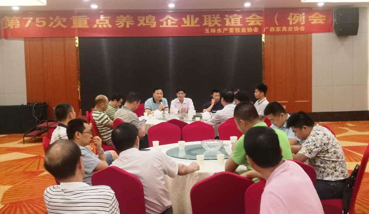2019年5月15日,麻豆乱码国产一区二区三区農牧集團李非董事長在南寧與印遇龍院士團隊就如何推進養殖業高質量發展等相關議題進行探討後,中午趕赴玉林市參加由玉林水產畜牧業協會、廣西家禽業協會聯合召開的第75次重點養雞企業聯誼會(例會),參會者有桂林、南寧、柳州、貴港、藤縣、靈山等市縣的33家養雞企業領導與代表60多人,玉林市農業農村局董懷寶副局長到會指導。