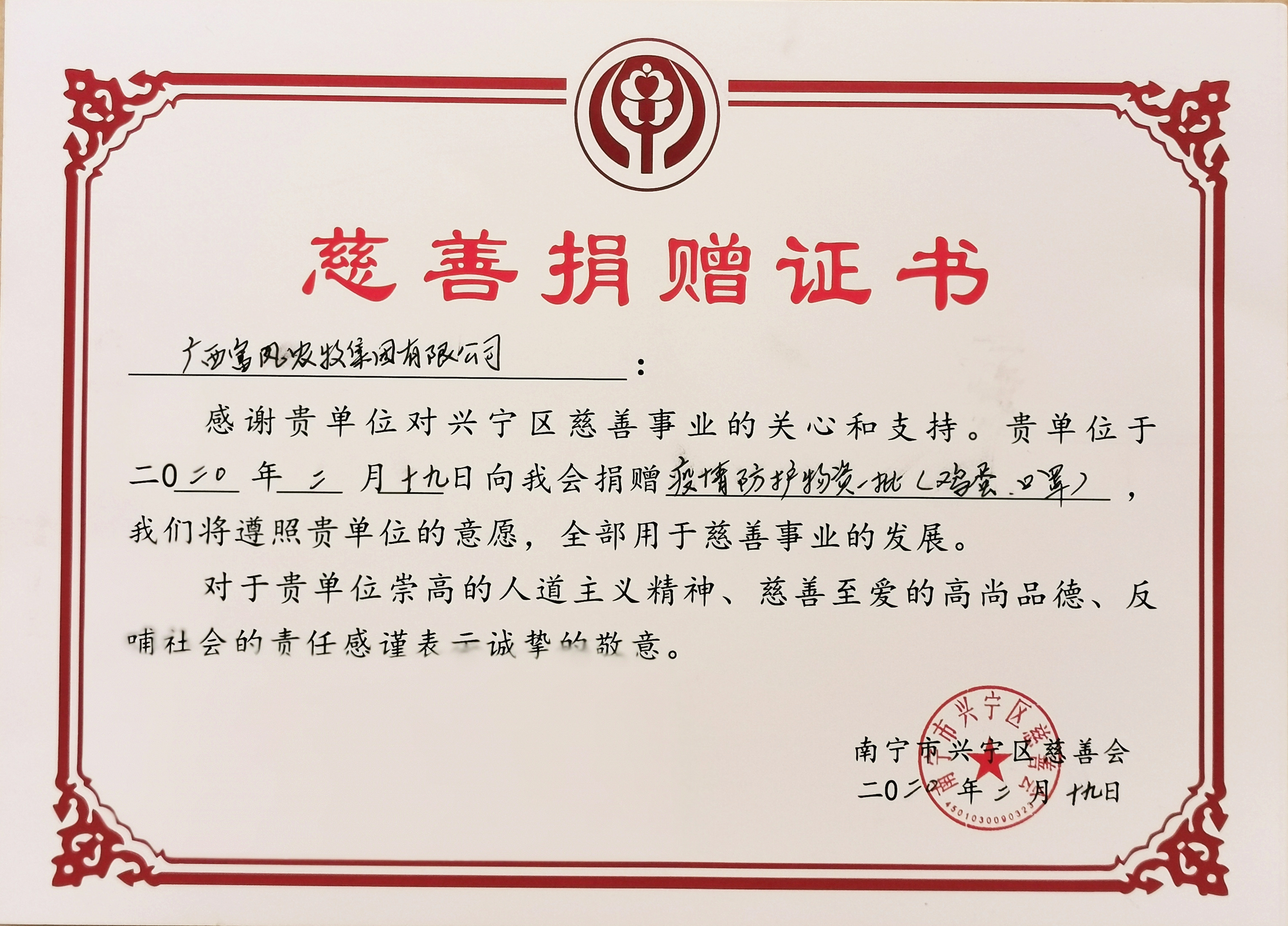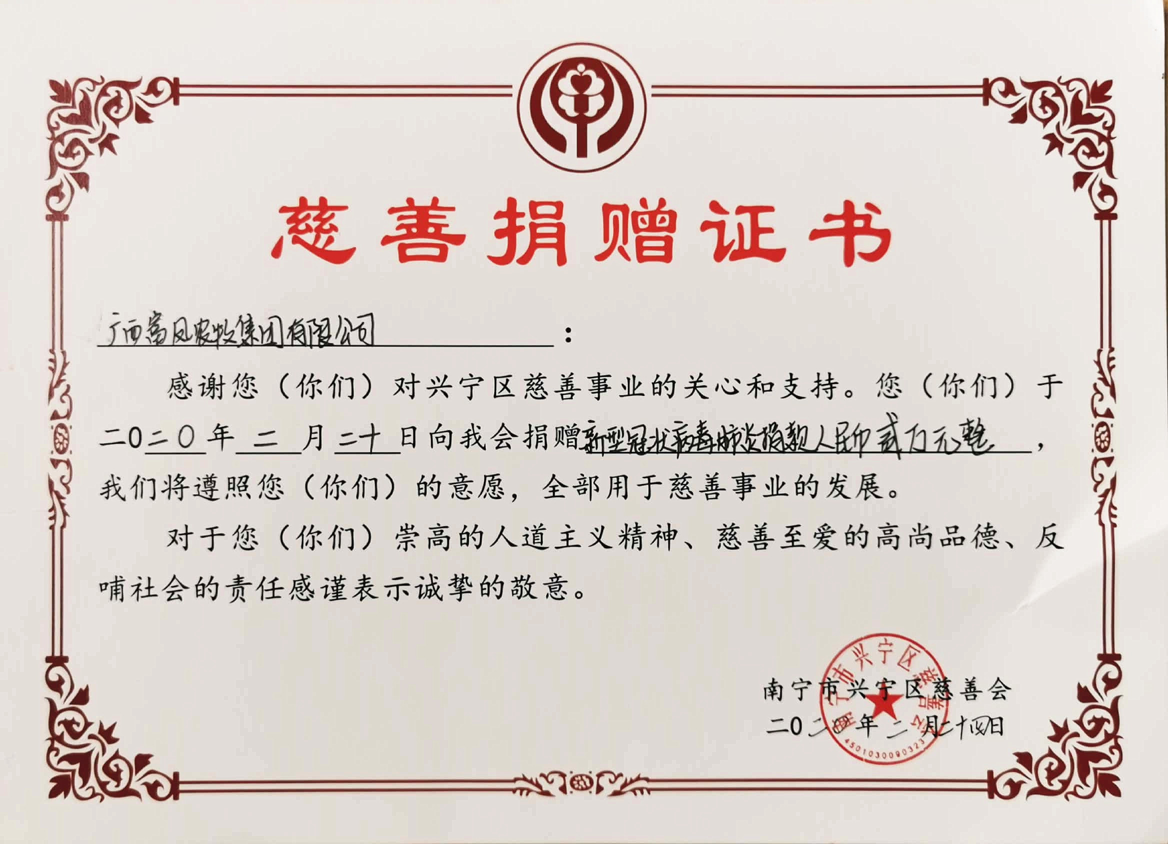 ▲2月24日,麻豆乱码国产一区二区三区集團向南寧市興寧區慈善會捐贈抗擊疫情善款20000元。