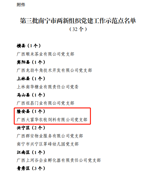 9月15日,中共南寧市委員會組織部、中共南寧市非公有製經濟組織和社會組織工作委員會南組通〔2020〕79號《關於公布第三批南寧市兩新組織黨建工作示範點名單的通知》,廣西大富華農牧麻豆影院在线观看有限公司黨支部確定為南寧市兩新組織黨建工作示範點。