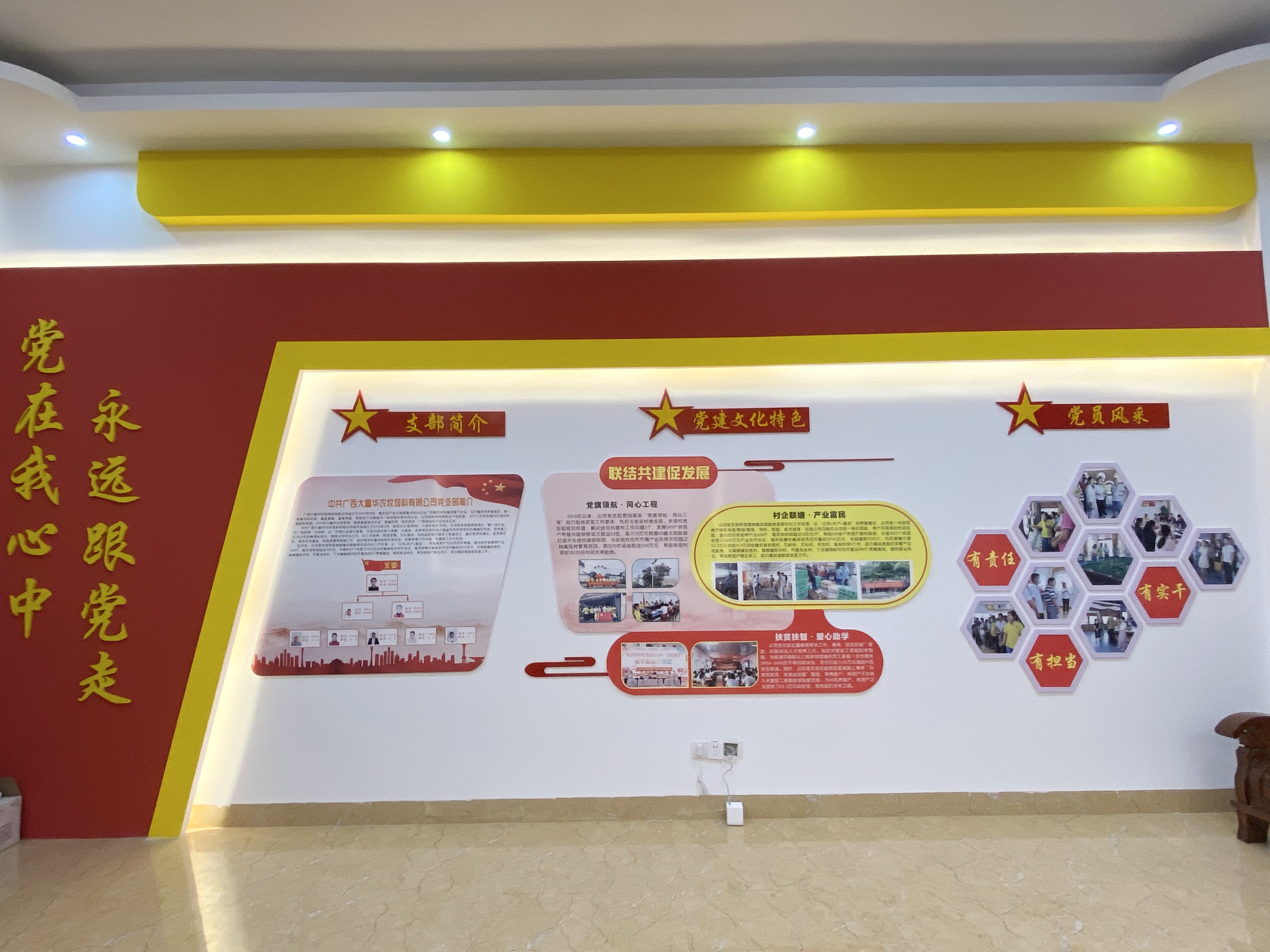 廣西大富華農牧麻豆影院在线观看有限公司在李非董事長的領導下,高度重視企業黨組織的建設和黨建活動的開展。2010年成立大富華黨支部,現有黨員9人,入黨積極分子3人,支部建有黨員活動室、黨建活動展板,配備豐富的黨建有關的圖書和音像製品等供黨員學習,積極發揮黨旗引領、黨組織的戰鬥堡壘作用,推動黨建與企業建設共同發展。多年來,大富華黨支部以優越的黨建設施和豐富多彩的企業黨建活動榮獲了“優秀黨支部”稱號。