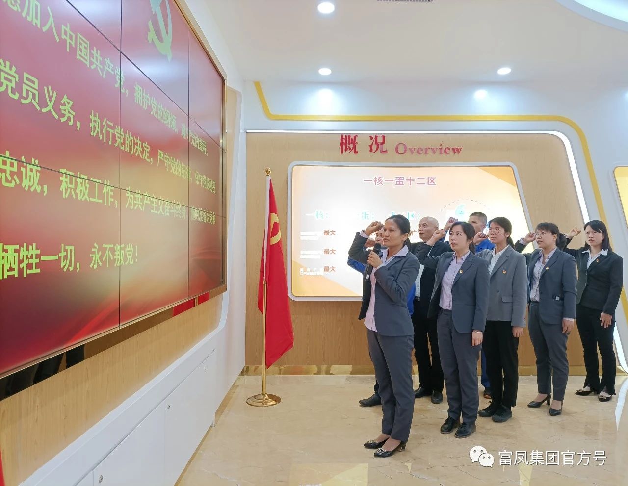 ▲廣西富鵬農牧有限公司黨支部在新當選支部書記陸海英的帶領下麵對黨旗重溫入黨宣誓。